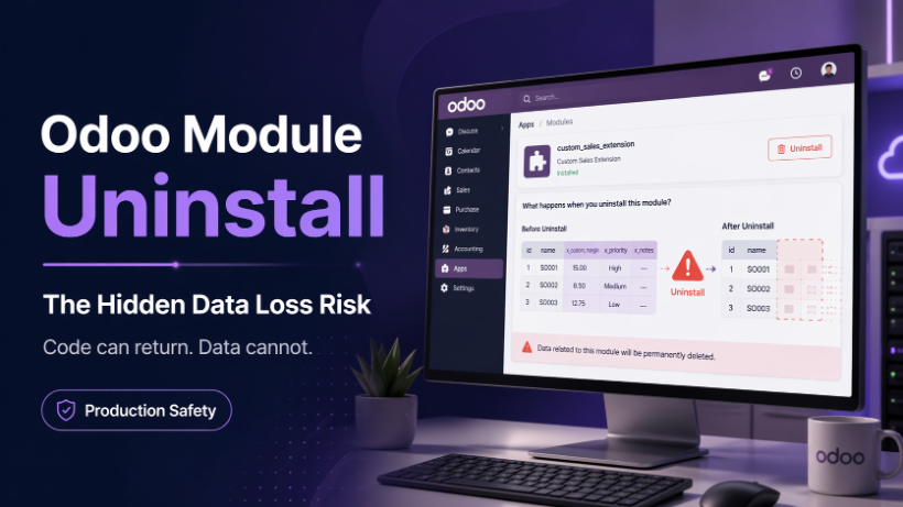 Uninstalling an Odoo module may remove more than code. It can also drop database fields and permanently erase accumulated business data. Learn the real risk and how to prevent it.